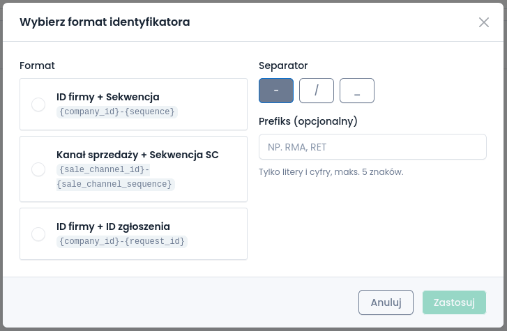 Nowy kreator pozwala samodzielnie zdefiniować format numeru RMA. Możesz uwzględnić np. własny prefiks, kanał sprzedaży czy sekwencję. Efekt? Zgłoszenia z RetJet wpasowują się w twoje procesy, a nie na odwrót.