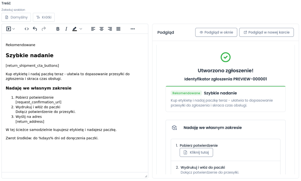 W RetJet można teraz skonfigurować osobne treści podsumowania dla obu typów zgłoszeń. Z dedykowaną treścią, wezwaniem do działania (CTA). Mniej nieporozumień, mniej zapytań i komunikacja, która faktycznie odzwierciedla proces obowiązujący w twoim sklepie.
