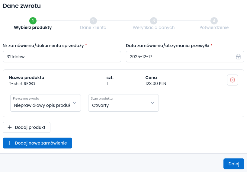 - Klient wpisuje podstawowe dane (np. numer zamówienia, telefon lub e-mail).