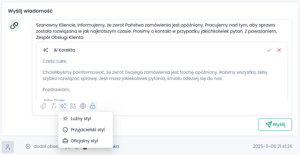 Na karcie zwrotu pojawiła się opcja skorzystania z asysty AI, która proponuje korektę treści wiadomości do klienta (np. uproszczenie, doprecyzowanie tonu). To narzędzie, nie automat, pracuje na podstawie wprowadzonego tekstu – podpowiedź można przyjąć lub edytować.